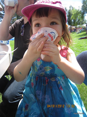 Evie had a great time at our church's picnic today. She got to enjoy various sweet treats the church prepared for everyone: cotton candies, snow cones, and oreos. It's her second time to have cotton candy. The first one was a long time ago. She couldn't figure out how to eat the fluffy treat. She would just lick it with her tongue so her Dada showed her how to eat a cotton candy. Her next sweet treat is a snow cone. This is her first time to have snow cone. She chose strawberry flavor (which seemed to be the most popular flavor among kids in the picnic). She loves ice, so the snow cone was a hit. However, when the ice started to melted, most of the liquid were dripping on her dress. She also got to try my blue berry snow cone and consumed everything. Getting her a hot dog for lunch didn't work at all after she saw the oreos on the table. The quantity of sugar she had during our stay in the picnic just made her so hyper. She was running all over the place and trying to chase the frisbee that the teens were playing with.
